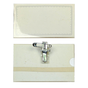Hard plastic name badge, with a clip and a safety pin at the back.
