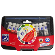 Plastic box of 10 assorted colored tubes of gouache in 18ml.